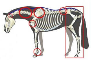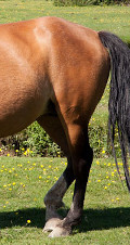 Wenn ein Pferd auf der Weide steht, satt ist und nicht bedroht, weder weglaufen muss noch nach Futter suchen, dann geht es in eine Ruhehaltung zwischen Schlaf und Überlebenskampf. Einer der beiden Hüften steht die andere Hinterhand entlastend etwas hoch, Kopf hängt leicht nach unten; für Detail auf das Foto links klicken (dann wieder schließen).