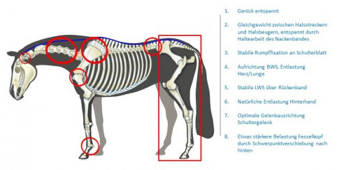 In dieser Haltung kann das Pferd innerhalb eines Wimpernschlags entweder flüchten oder sonstwie angemessen auf die jeweilige Situation reagieren. Es ist allzeit bereit ohne sich zu stressen, ruht auf der Schwelle zwischen d'rauf hauen oder abhauen einerseits (Anspannnung) und Schlaf andererseits (Entspannung), ohne sich auf das eine oder andere festgelegt zu haben. Es befindet sich in einer Wohlspannung.